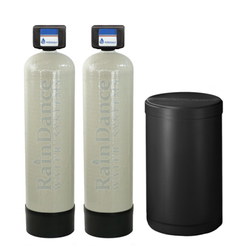 Metered, 1 1/2" Plumbing Ports, High Flow Twin Water Softeners from RainDance Water Systems. Softening systems for Large Homes, Apartments/Condominiums, Car Washes, Boiler Feed water, Hospitals, Laundries, Manufacturing Plants, Office Complexes, Institutions, Food Processing Plants, Cafes, Bars, Restaurants, Farms, and Businesses. Protect your equipment from hard water scale!